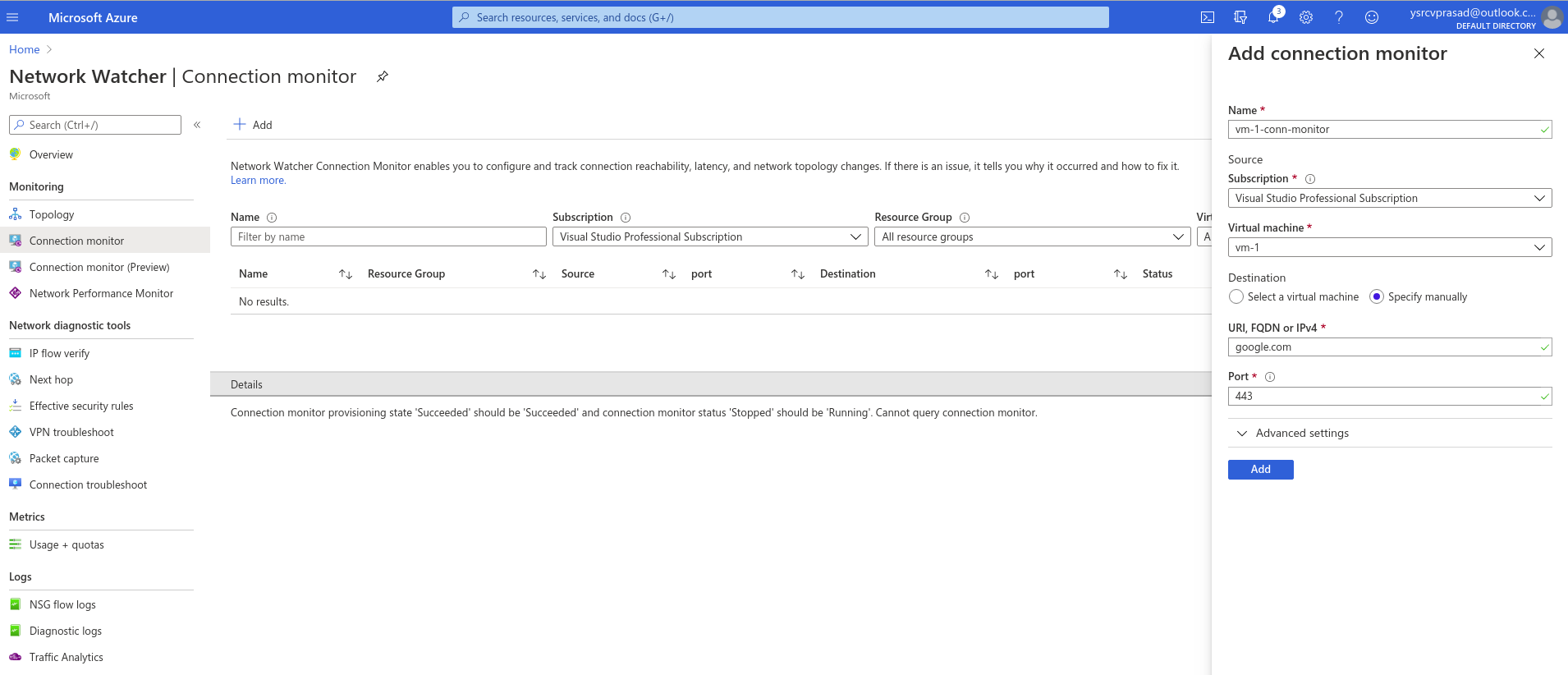 Network Watcher Connection Troubleshoot provides the capability to check a direct TCP connection from a virtual machine (VM) to a VM, fully qualified domain name (FQDN), URI, or IPv4 address. To start, choose a source to start the connection from, and the destination you wish to connect to and select “Check”. See the screenshots below.