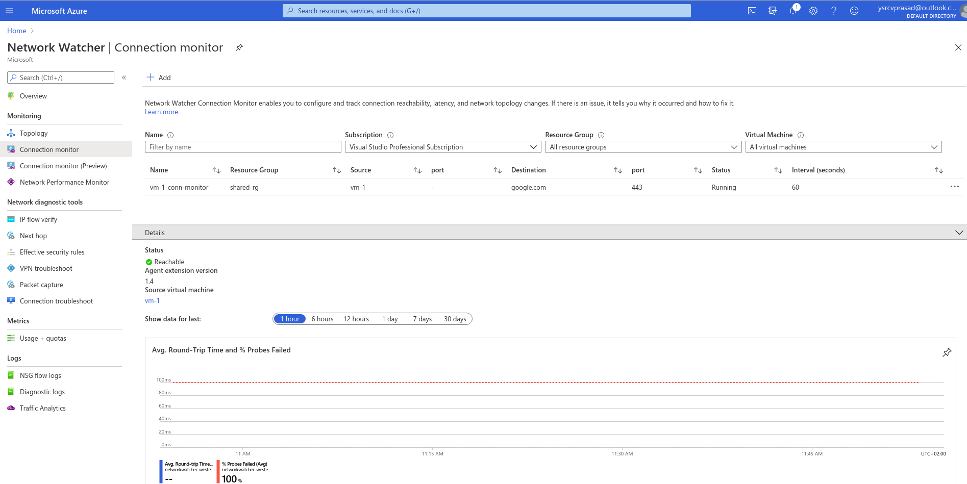 Network Watcher Connection Monitor enables you to configure and track connection reachability, latency, and network topology changes. If there is an issue, it tells you why it occurred and how to fix it.